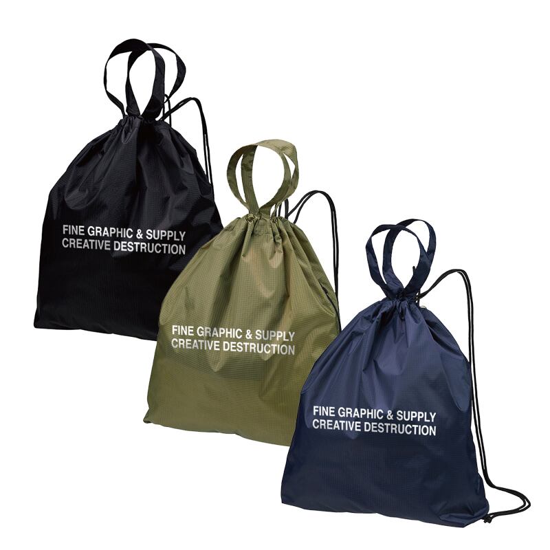 裏側にアクリルコーティングを施した軽量ナイロンのリップストップ生地を使ったナップサックです。サイドファスナーが付いているので背負ったままで、しまったギアをイージーに取り出すことが可能。背面にバナーロゴをプリントしています。