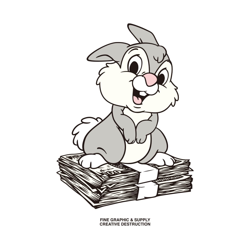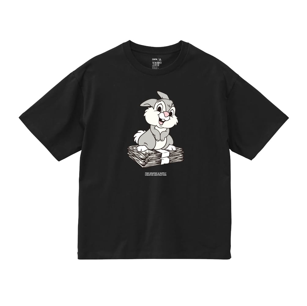 おなじみのキャラクターが札束の上に乗り満足げに笑みを見せるシニカルで可愛らしい 1 着。