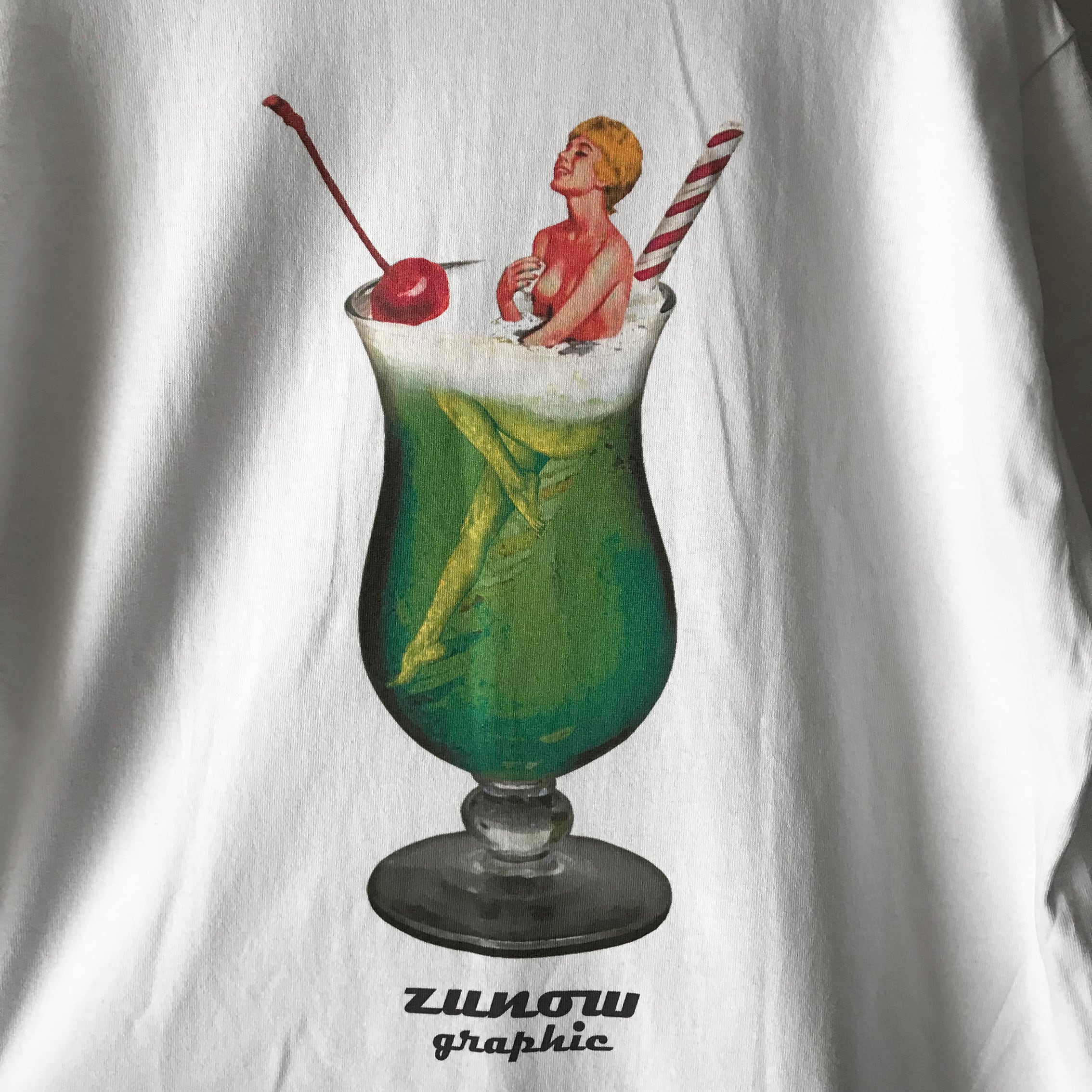 鮮やかなグリーンのクリームソーダの中にセクシーなピンナップガールを浮かべた、涼しげなイメージのバックプリント。